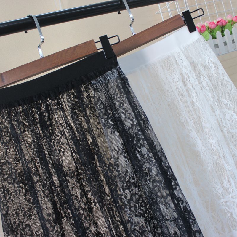 Hot Summer Women Lace Skirts Fashion Solid Casual Mesh Tulle Skirt Hollow Out Short Pencil Elegant Elastic Black White Skirt