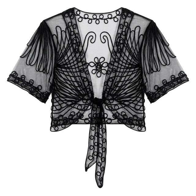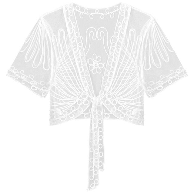 Short Sleeve V-Neck Tie Knot Mesh Bolero Crop Top-Multiple Options